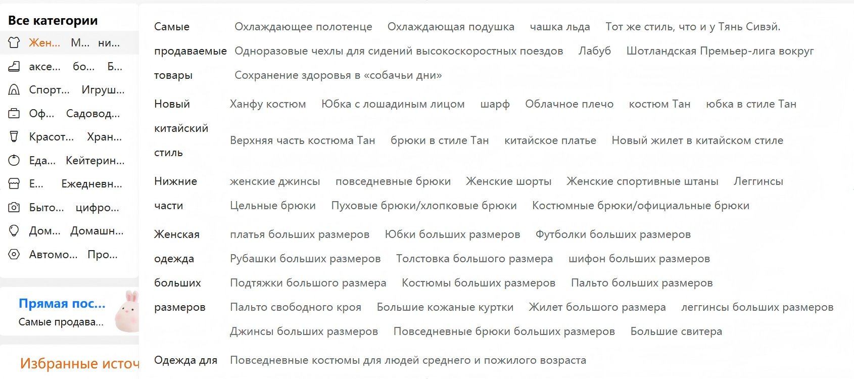 Наведите курсор на нужную категорию (например, «女装» — женская одежда).