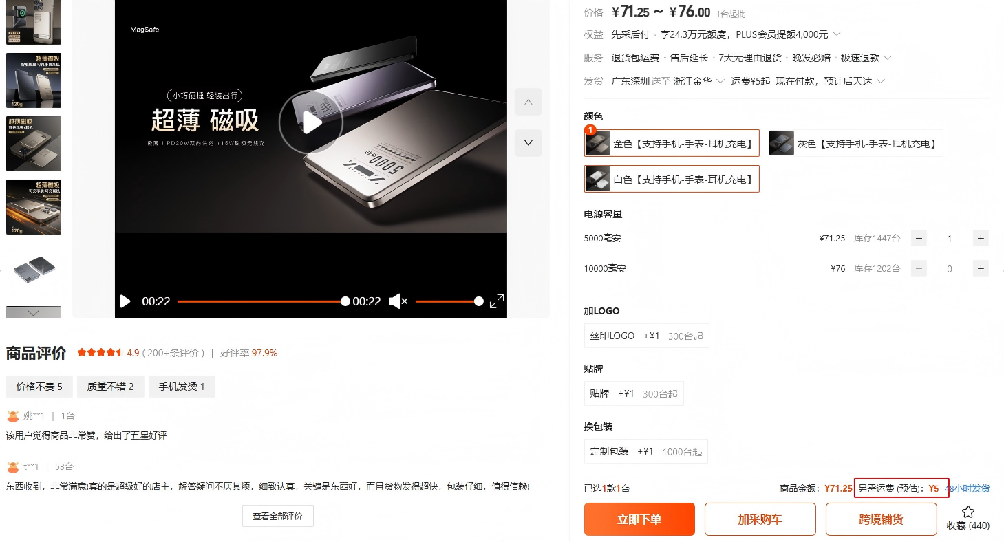 «实力商家» (Значок «Бык» / Проверенный поставщик): Ключевой значок. Говорит о том, что 1688 проверил юридическую информацию и производственные мощности компании. Это приоритетный поставщик.